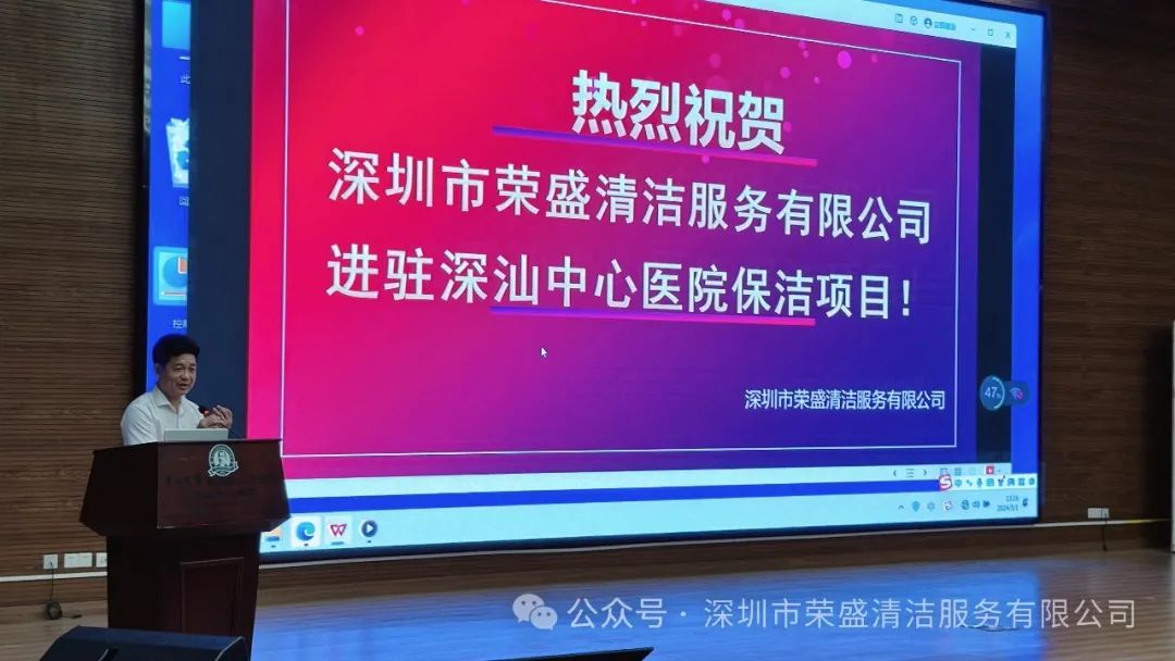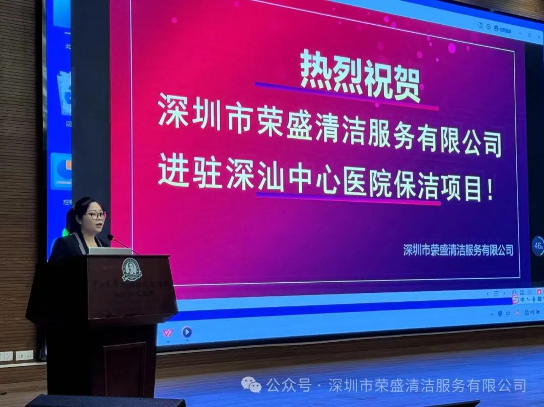 5月1日下昼四时,深圳市金地物业有限公司向导和全体项目员工搜集医院礼堂,欢庆深圳市云顶集团清洁服务有限公司正式进驻深汕中心医院,员工吃着点心,喝着饮料,看着公司宣传片,听着公司董事长热情洋溢的致词,现场一片欢悦和喜悦。